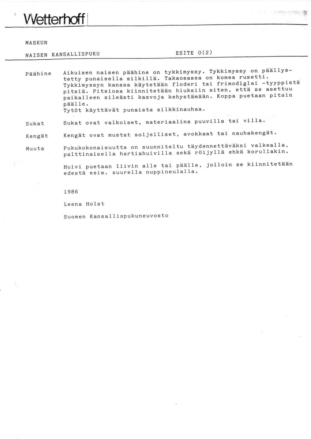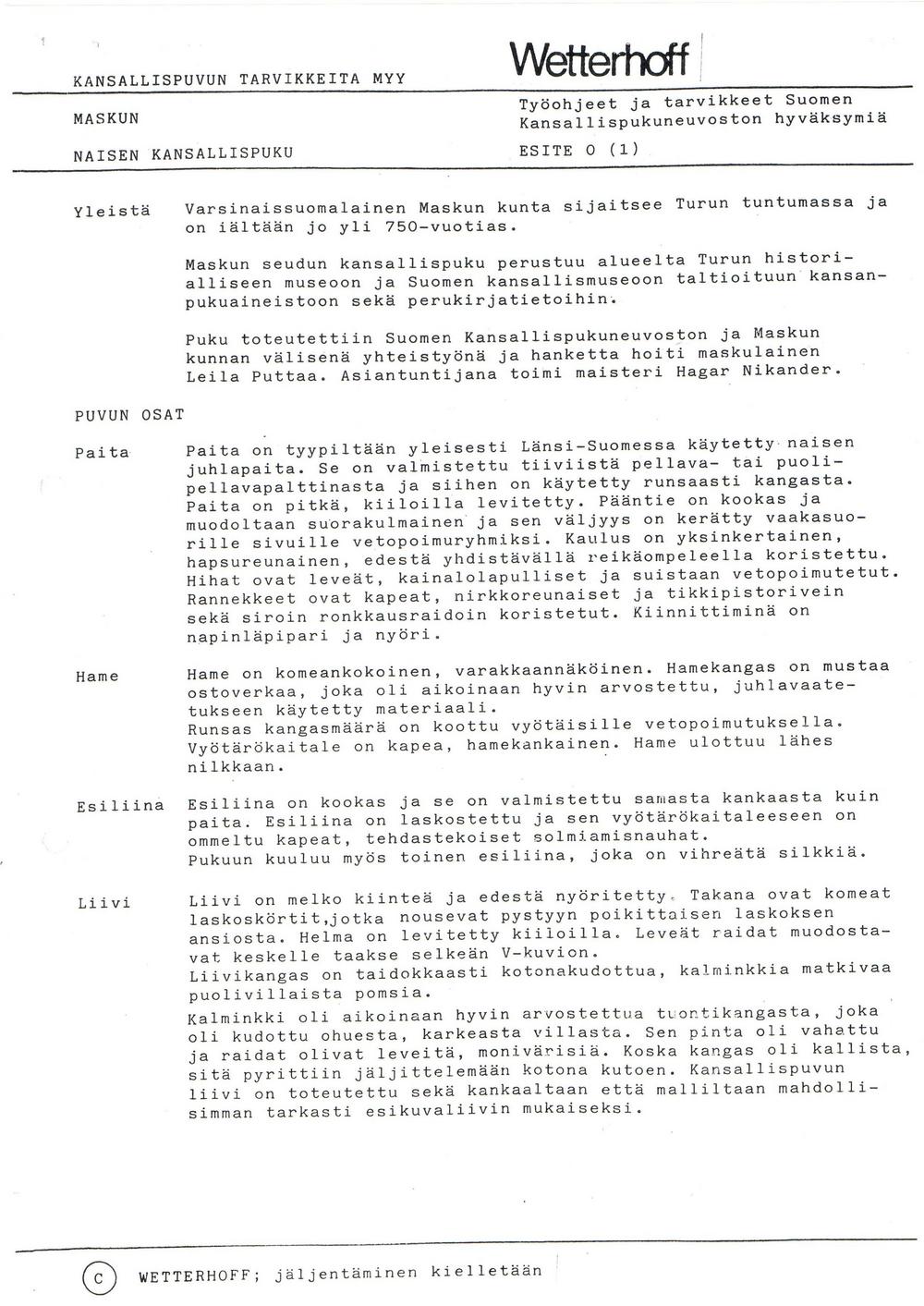 Maskun seudun kansallispuvun ohjeiden ja lankojen myynti